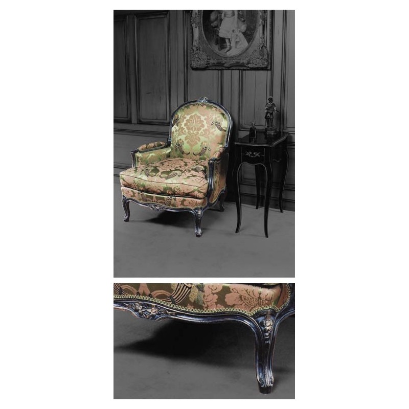 BERGERE "A LA REINE" Louis XV, Eric MARJOLET Caractéristiques: Bois: Hêtre. Tissu A - Cornucoppia (autre tissu: nous contacter). Teintes bois: BOURGOGNE, IVOIRE, VERT OLIVE, TURQUOISE, PIVOINE, CORAIL, NOIR Cliquez ici pour visualiser les teintes bois coordonnées ou Teinte au choix parmi le nuancier RAL (sans supplément de prix): Cliquez ici pour visualiser les teintes nuancier RAL Nous vous recontactons dès reception de votre commande pour valider ou définir vos teintes. Dimensions: Hauteur: 96 cm, Hauteur d'assise: 41 cm, Largeur: 68 cm, Profondeur: 63 cm.