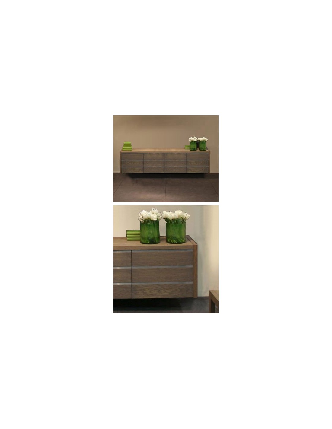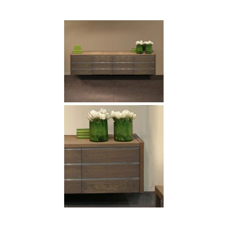 Buffet 4 portes suspendu LANDSCAPE Moderne et épuré, ce buffet prendra simplement sa place dans votre intérieur. Avec ou sans inox. Structure et Assemblage: Panneaux et façades chêne massif, autres éléments bois avec placage chêne. Portes, façades et tiroirs sur rails métalliques cachés. Décoration: Inox épaisseur 3 mm Dimensions: Longueur 248 cm, Profondeur 52 cm, Hauteur 69 cm Différentes teintes de bois possibles: Cliquez ici pour visualiser les échantillons bois