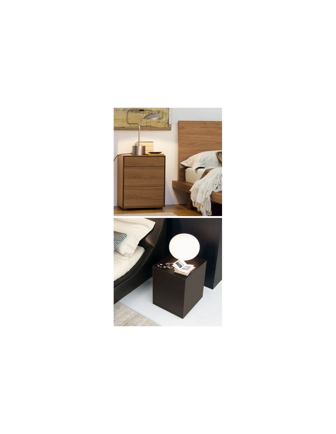 Chevet 3 tiroirs AXEL, JESSE Chevet en finition chêne foncé ou noyer.Panneaux de particules de bois (classe E1: basse émission de formaldéhyde) plaqué noyer ou MLW chêne et réalisés avec technique du folding.Egalement disponible laqué avec peinture blanche brillante, nous contacter.Tiroirs avec coulisses métaliques à galets et fermeture avec cliquet de type "push-pull". Dimensions: Largeur: 40 cm Profondeur: 45 cmHauteur: 51 cm