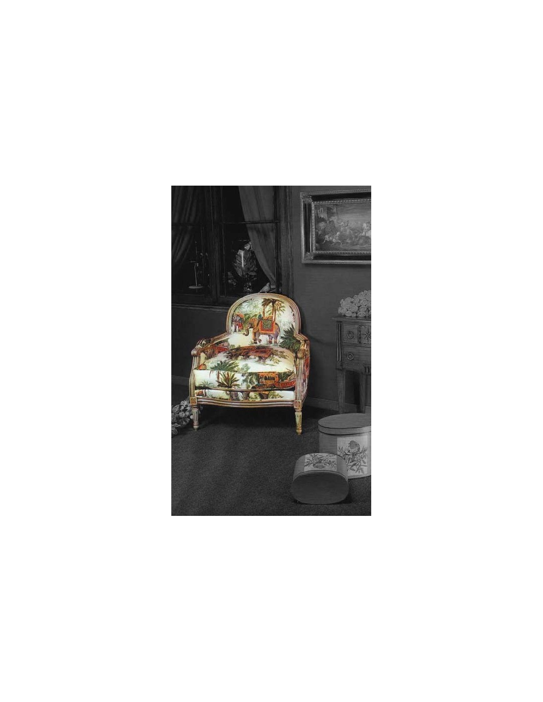 Petite BERGERE Louis XVI, Eric MARJOLET Caractéristiques: Bois: Hêtre. Tissu B - Eléphants (autre tissu: nous contacter). Teintes bois: BOURGOGNE, IVOIRE, VERT OLIVE, TURQUOISE, PIVOINE, CORAIL, NOIR Cliquez ici pour visualiser les teintes bois coordonnées ou Teinte au choix parmi le nuancier RAL (sans supplément de prix): Cliquez ici pour visualiser les teintes nuancier RAL Nous vous recontactons dès reception de votre commande pour valider ou définir vos teintes. Dimensions: Hauteur: 79 cm, Hauteur d'assise: 51 cm, Largeur: 67 cm, Profondeur: 64 cm.