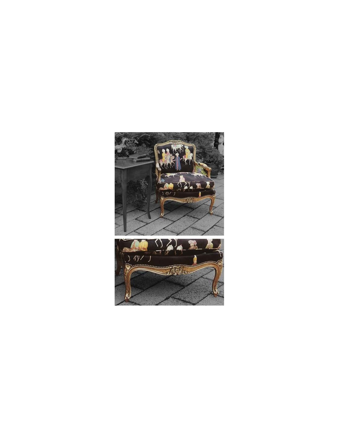 Fauteuil Louis XV, Eric MARJOLET Caractéristiques: Bois: Hêtre. Tissu AA - Parade Ottomane (autre tissu: nous contacter). Coussin 1/2 duvet. Teintes bois: BOURGOGNE, IVOIRE, VERT OLIVE, TURQUOISE, PIVOINE, CORAIL, NOIR Cliquez ici pour visualiser les teintes bois coordonnées ou Teinte au choix parmi le nuancier RAL (sans supplément de prix): Cliquez ici pour visualiser les teintes nuancier RAL Nous vous recontactons dès reception de votre commande pour valider ou définir vos teintes. Dimensions: Hauteur: 90 cm, Hauteur d'assise: 54 cm, Largeur: 73 cm, Profondeur: 59 cm.