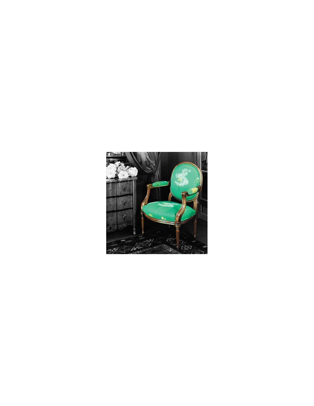 Cabriolet Louis XVI Médaillon, Eric MARJOLET Caractéristiques: Bois: Hêtre. Tissu AA - A la Folie (autre tissu: nous contacter). Teintes bois: BOURGOGNE, IVOIRE, VERT OLIVE, TURQUOISE, PIVOINE, CORAIL, NOIR Cliquez ici pour visualiser les teintes bois coordonnées ou Teinte au choix parmi le nuancier RAL (sans supplément de prix): Cliquez ici pour visualiser les teintes nuancier RAL Nous vous recontactons dès reception de votre commande pour valider ou définir vos teintes. Dimensions: Hauteur: 110 cm, Hauteur d'assise: 49 cm, Largeur: 62 cm, Profondeur: 50 cm.