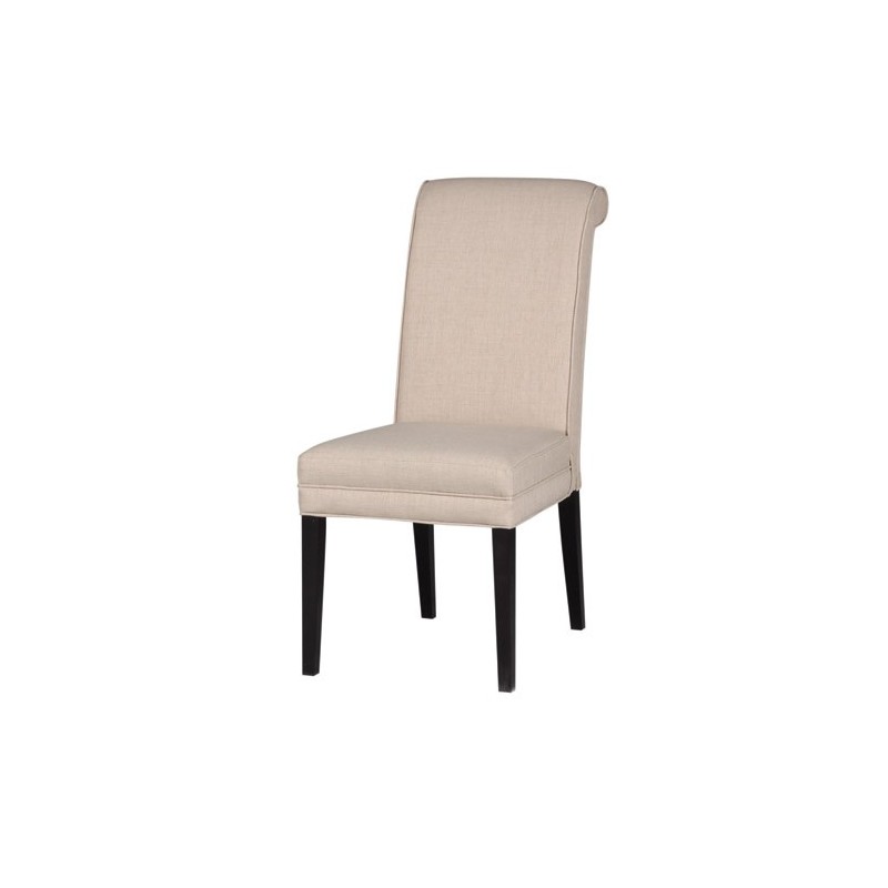 Chaise contemporaine.Piètement laqué noirRecouvrement : Tissu beige82% Polyester - 15% Coton - 3% PUDimensions: H:98 x L:47 x P:46