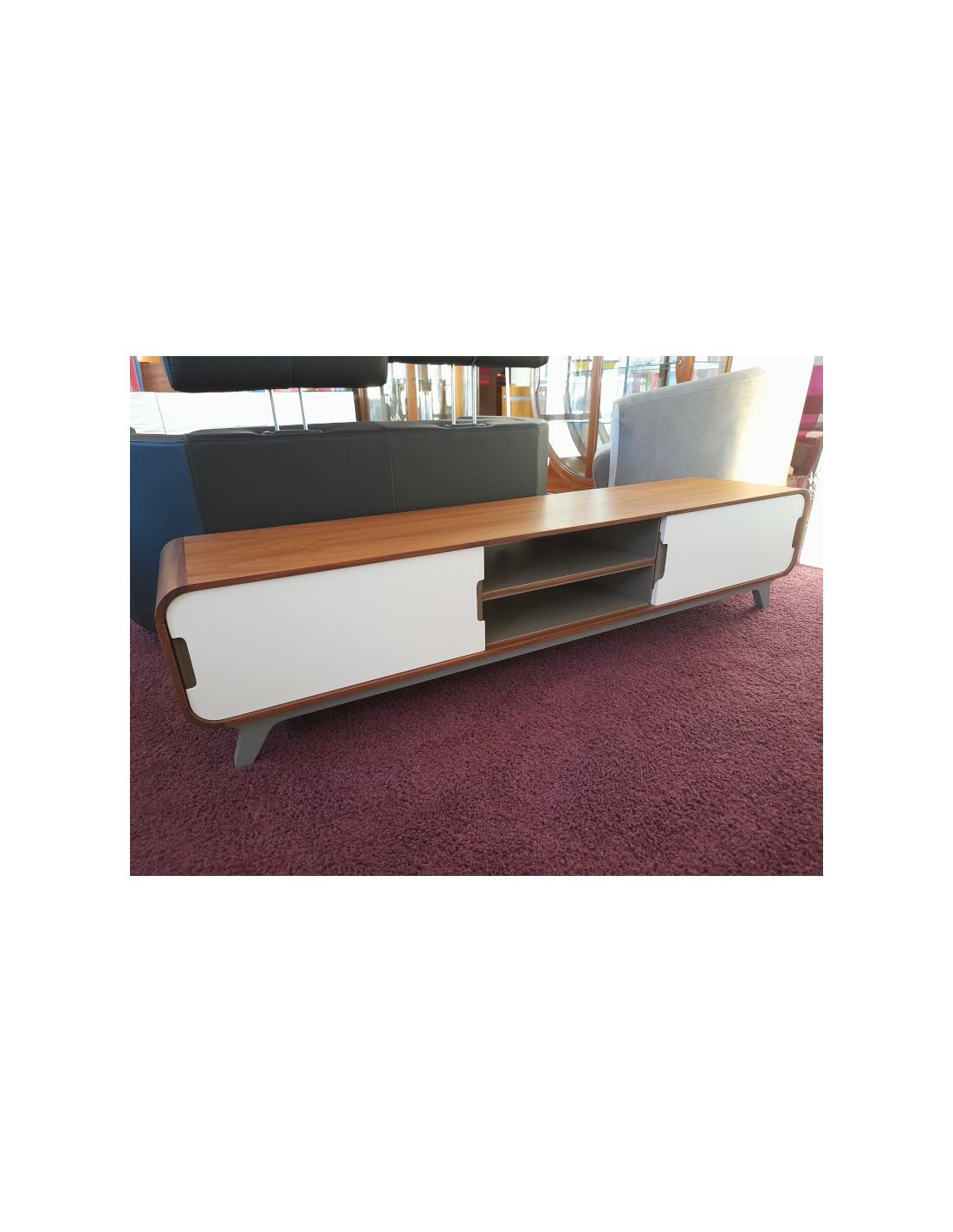 Meuble TV noyer naturel 220cm x 40cm x 40cm, portes laquées blanc, niches laquées blanc, pieds laqués noir