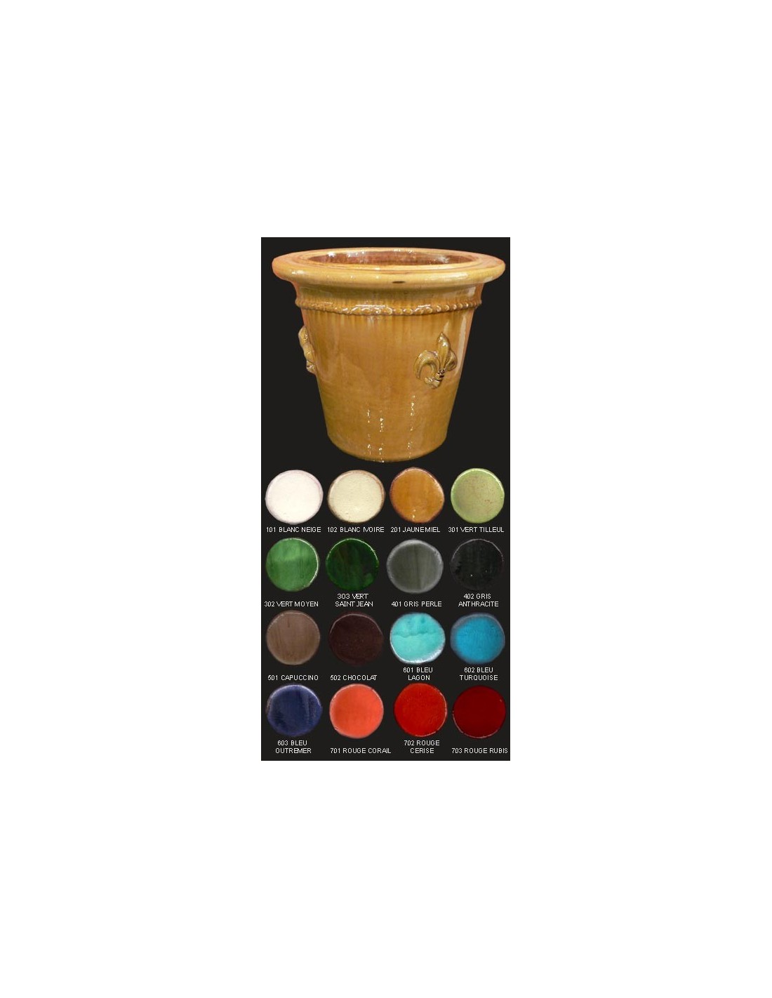 Vase COMPOSTELLE, Diamètre 44 cm, décor Fleur de Lys Caractéristiques: La fabrication faite entièrement dans les ateliers de Saint Jean de Fos est artisanale et manuelle. Après montage, le vase est engobé puis suit une longue période de séchage. L'émaillage fait à l'arrosoir permet d'obtenir des nuances superbes dues au choix des oxydes et aux superpositions. Après une longue cuisson, les vases les plus clairs peuvent être vieillis par sablage puis application manuelle d'une patine. Dimensions: Diamètre extérieur: 44 cm, Diamètre intérieur: 30 cm, Hauteur: 38 cm. Nos vases étant réalisés de façon artisanale, les couleurs, les poids et dimensions sont indicatifs. Nous vous conseillons d'utiliser nos vases comme cache-pots, en décoration intérieure ou extérieure, ou de les isoler du contact de l'eau contenue dans la terre et la plante par un hydrofuge liquide ou un voile d'hivernage. Il est préférable de rentrer les vases de petite taille en période hivernale.