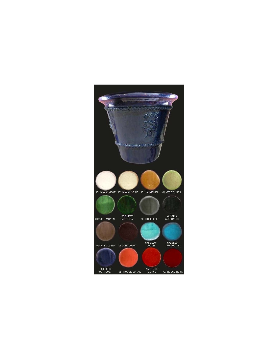 Vase COMPOSTELLE, Diamètre 88 cm, décor Faune Caractéristiques: La fabrication faite entièrement dans les ateliers de Saint Jean de Fos est artisanale et manuelle. Après montage, le vase est engobé puis suit une longue période de séchage. L'émaillage fait à l'arrosoir permet d'obtenir des nuances superbes dues au choix des oxydes et aux superpositions. Après une longue cuisson, les vases les plus clairs peuvent être vieillis par sablage puis application manuelle d'une patine. Dimensions: Diamètre extérieur: 88 cm, Diamètre intérieur: 68 cm, Hauteur: 82 cm. Nos vases étant réalisés de façon artisanale, les couleurs, les poids et dimensions sont indicatifs. Nous vous conseillons d'utiliser nos vases comme cache-pots, en décoration intérieure ou extérieure, ou de les isoler du contact de l'eau contenue dans la terre et la plante par un hydrofuge liquide ou un voile d'hivernage. Il est préférable de rentrer les vases de petite taille en période hivernale.
