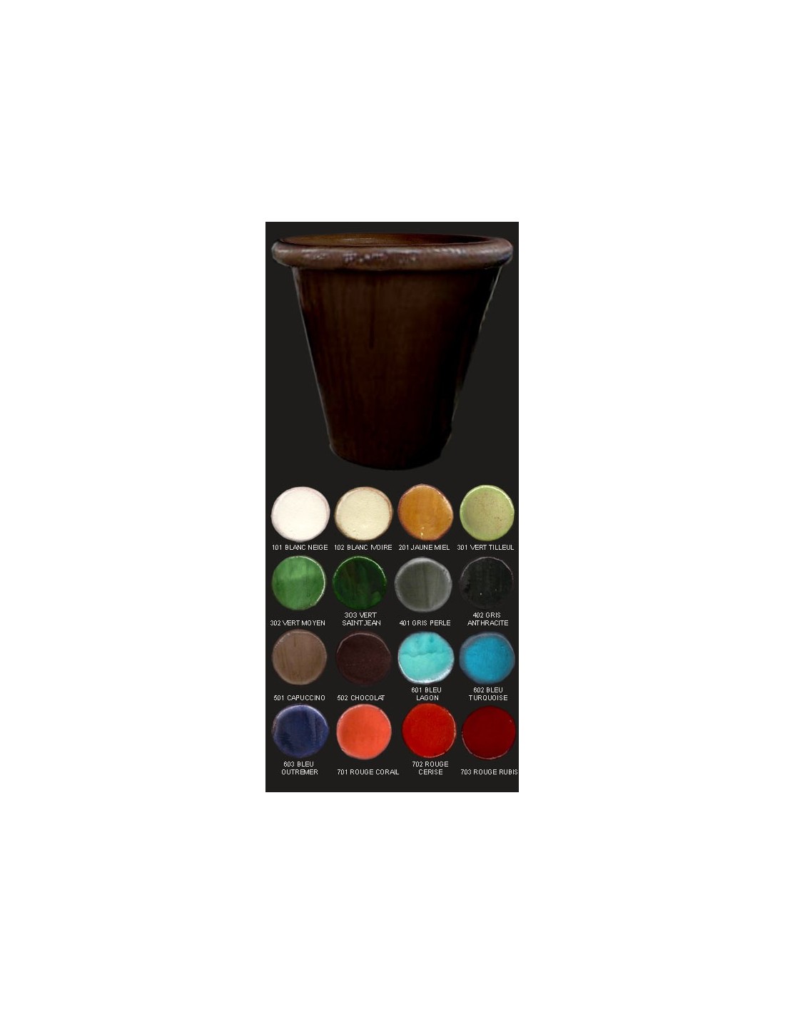 Vase CUVIER, Diamètre 48 cm, CHOCOLAT Caractéristiques: La fabrication faite entièrement dans les ateliers de Saint Jean de Fos est artisanale et manuelle. Après montage, le vase est engobé puis suit une longue période de séchage. L'émaillage fait à l'arrosoir permet d'obtenir des nuances superbes dues au choix des oxydes et aux superpositions. Après une longue cuisson, les vases les plus clairs peuvent être vieillis par sablage puis application manuelle d'une patine. Dimensions: Diamètre extérieur: 48 cm, Diamètre intérieur: 38 cm, Hauteur: 49 cm. Nos vases étant réalisés de façon artisanale, les couleurs, poids et dimensions sont indicatifs. Nous vous conseillons d'utiliser nos vases comme cache-pots, en décoration intérieure ou extérieure, ou de les isoler du contact de l'eau contenue dans la terre et la plante par un hydrofuge liquide ou un voile d'hivernage. Il est préférable de rentrer les vases de petite taille en période hivernale.